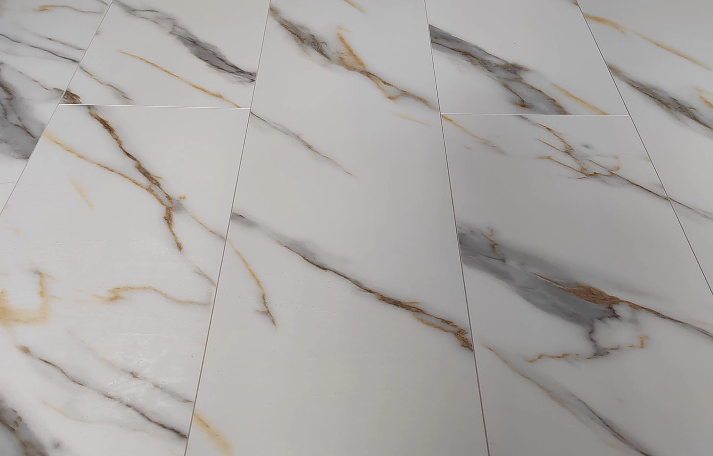 Минерально-каменный MSPC ламинат Мрамор Бело-Золотой — это декор, имитирующий изысканную текстуру белого мрамора, в формате большой крупной плитки (Big Stone) размером 1220*234 мм. Бело-золотой Мрамор имеет 4-сторонюю глубокую V-образную фаску. Так как сам материал обладает 100 % водостойкостью и крайне низким коэффициентом термореактивности, этот дизайн используют при укладке во всех зонах квартиры и зачастую там, где теплый пол является основным источником отопления. Без пороговая укладка в помещениях — до 240 м2. Возможность монтажа под тяжелую мебель — да. Возможность нагрева до +70° С без потери гарантии (может выдержать аварийный нагрев до + 114 С). Есть антивандальная обработка поверхности от появления царапин и выцветания на солнце.